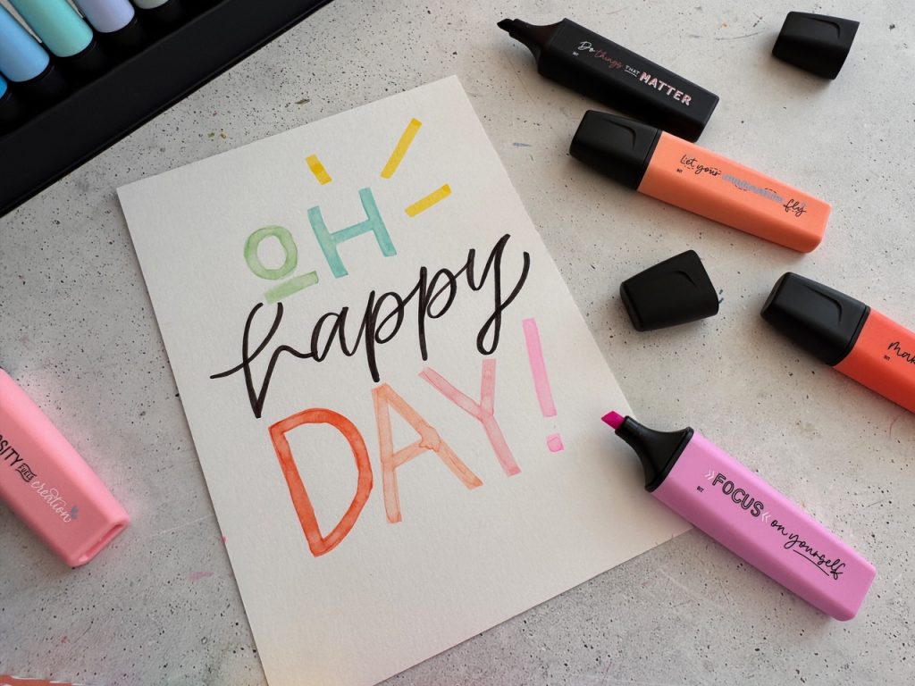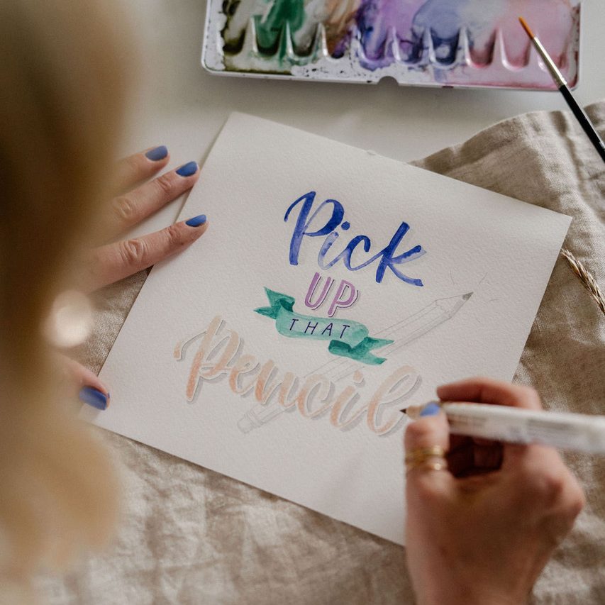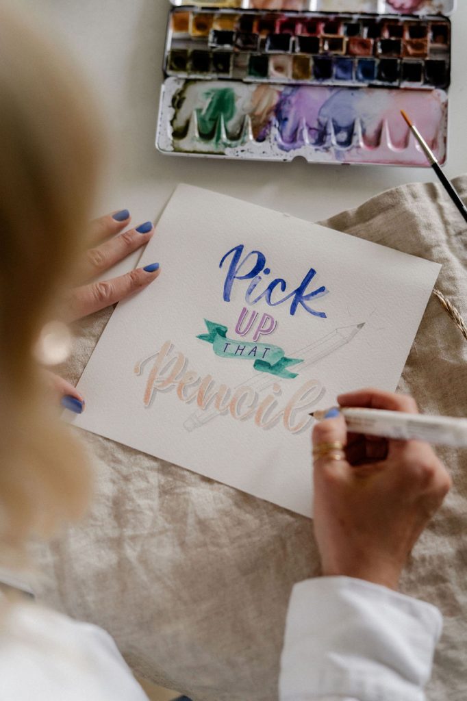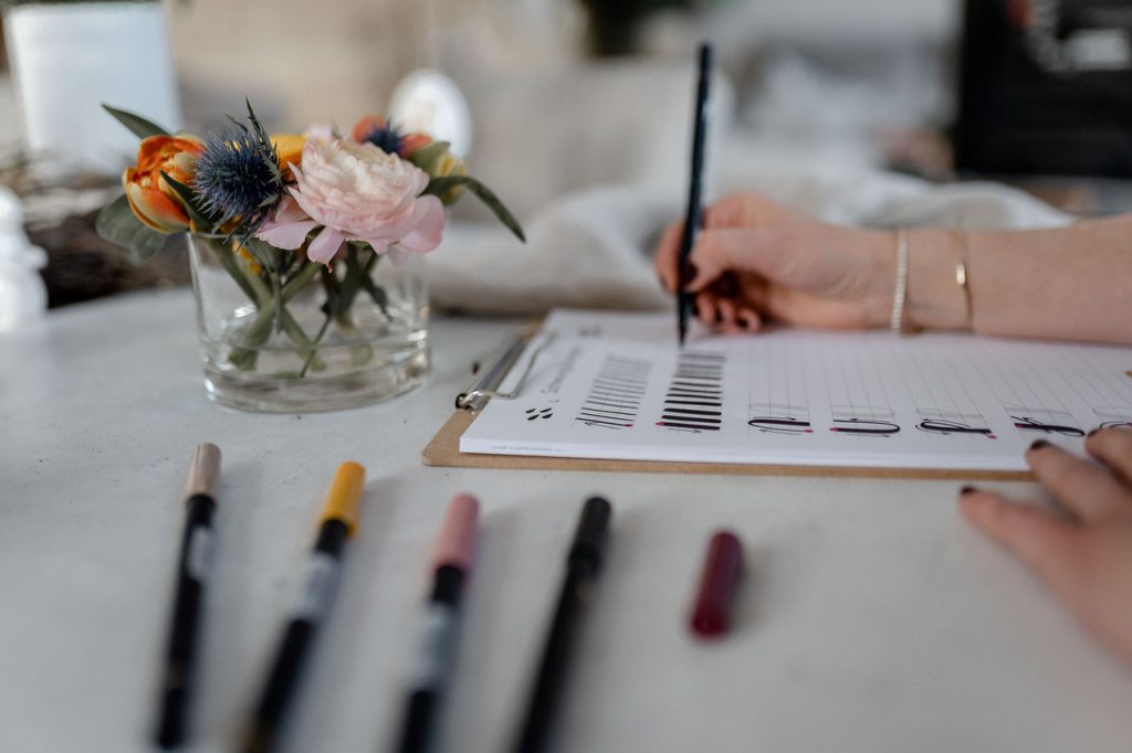 „Im Frühjahr 2018 bin ich durch eine Freundin zum Handlettering gekommen und war sofort verliebt in das Malen schöner Buchstaben. Was als „Ich probiere das jetzt auch mal aus!“ begann, ist zu einer großen Leidenschaft geworden und es vergeht seitdem fast kein Tag, an dem ich nicht den Stift oder Pinsel in der Hand halte.“