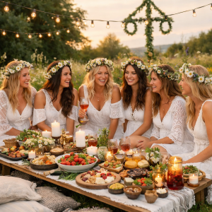 Ein festlicher Nachmittag in weißen Kleidern und Blumenkränzen als Symbol für die Fülle und Schönheit des Lebens.